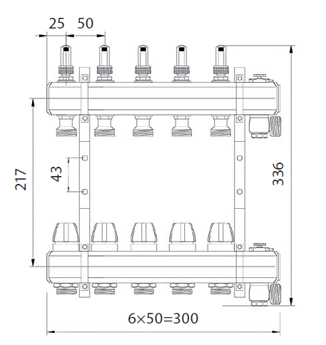 Pripojenie rozdeľovača je ukončené 1” vnútorným závitom. Druhá strana nosníka je zaslepená 1” zátkou