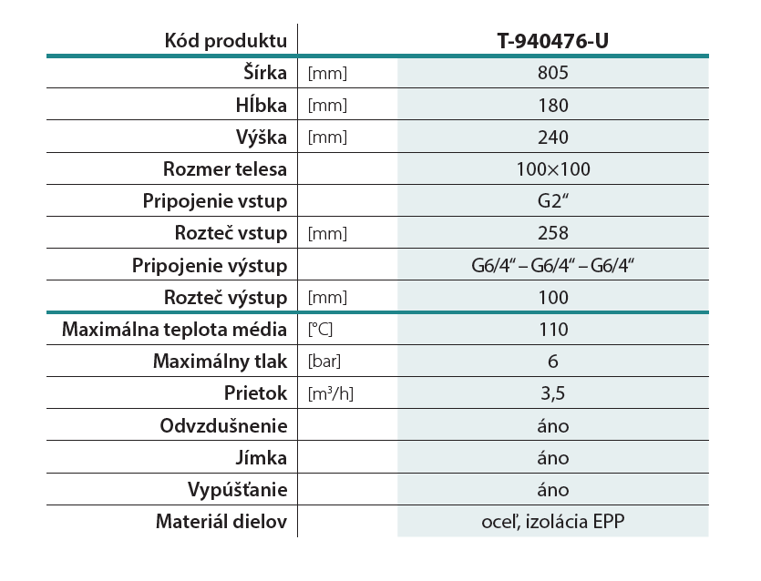 Oceľová konštrukcia 100x100mm s jedným vstupom a troma výstupmi. Jímka pre teplomer, teplomer, vypúšťací a odvzdušňovací ventil je súčasťou vybavenia.