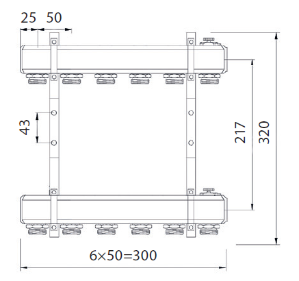 Pripojenie rozdeľovača je ukončené 1” vnútorným závitom. Druhá strana nosníka je zaslepená 1” zátkou
